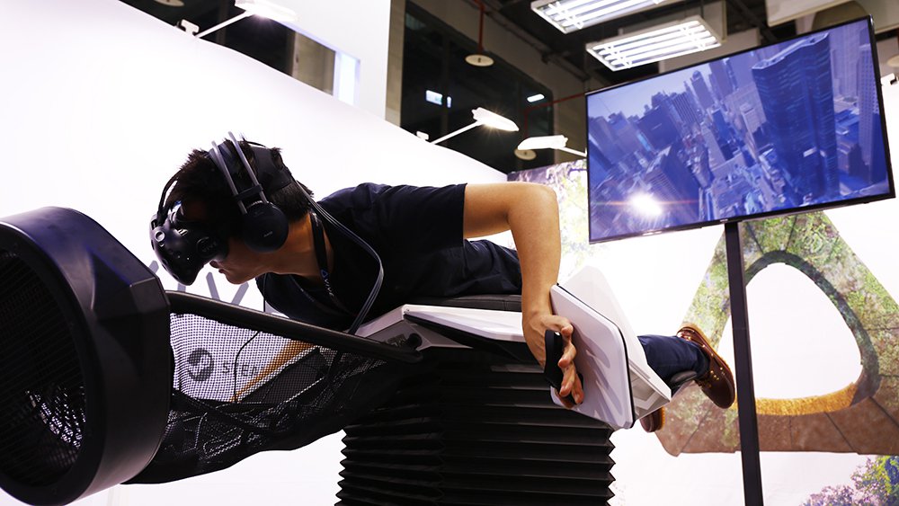 HTC Vive虚拟现实装置,搭上轻巧又出奇敏捷的飞行机台,足以在戴上头盔的短短数秒间,就浑然忘了几十年生而为人的一切本能。彷佛重新转生成为一只老鹰,前一秒还在纽约中央公园上方拍拍略为生疏的翅膀,下一步就在大楼小巷间乘风穿梭,好像自己出生以来都一直如此的自然快活。