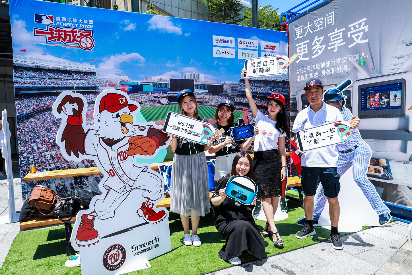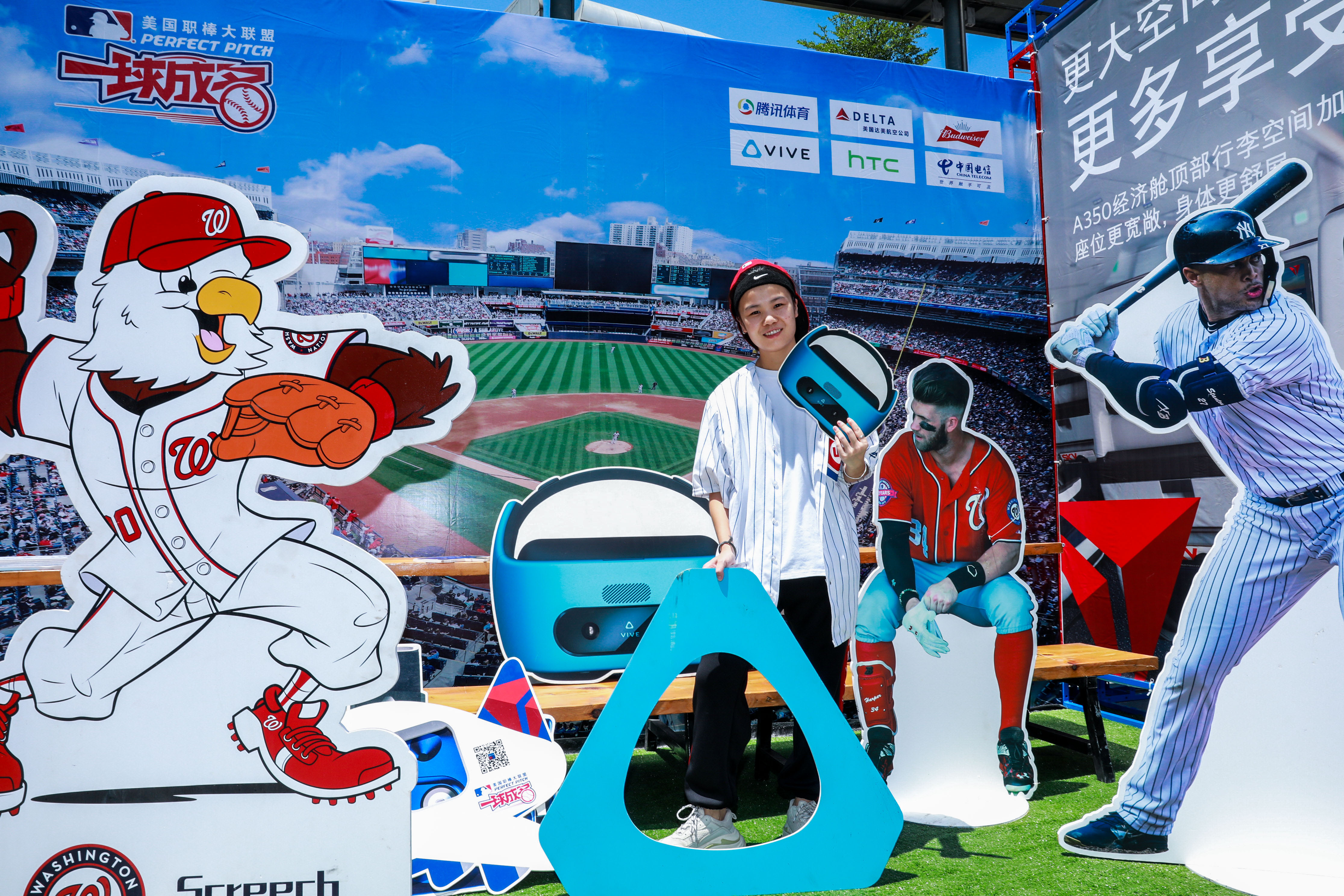 在“MLB一球成名 梦想本垒打”拍照区有许多与MLB和Vive相关的有趣道具,比如棒球帽、棒球服、明星球员立牌、可爱标语等等,也是粉丝打卡必拍哦!